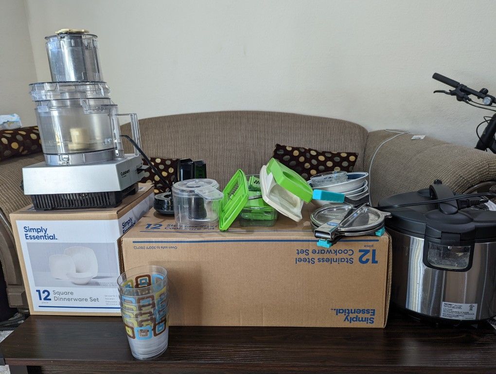 | Product Features | Starting a new Kitchen?Renting or AirBNBing Apartment/Home?Very few items of the Cookware set have gone, so reducing pricethis is a whole set of utensils, dinner set, rice cooker, food processor, chopper. The only missing thing is Mugs. Otherwise it's a complete set to start a new Kitchen. All appliances in perfectly working condition l.Siqmply Essential Cookware set of 12 (rarely used, with original packaging) Simply Essential Dinnerware set of 12 (rarely used, with original packaging).Cuisinart Food Processor with all attachments.Aroma Rice Cooker.Electric Chopper, Vegetable Hand Chopper with all is 10 attachments.and Steamer Mop | ||