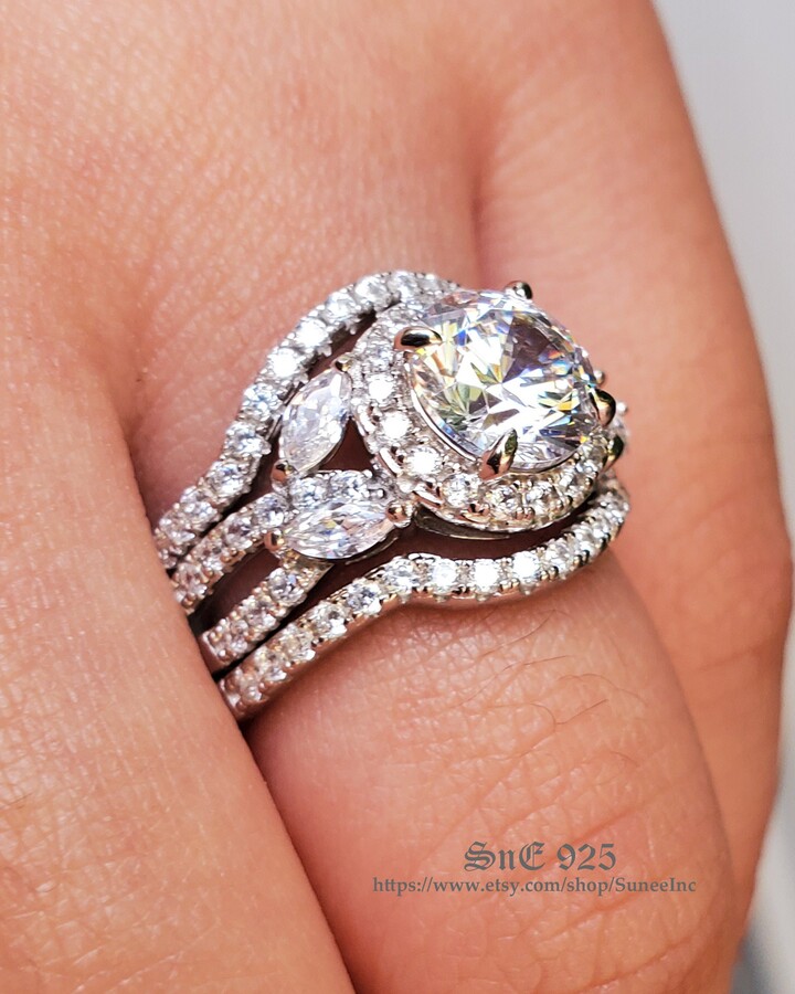 | Product Features | Details:These rings are set with beautiful high quality 5A simulated stones to have a similar clarity & brilliance of an authentic diamonds These means your stones will be sparkling, eye-catching, & full of fire. Three pieces Women's Halo Round Cut with Marquise Engagement Ring Set total carat weight is about 3.20ct Main stone is about 2 carat big 1.0 mm Accent Stones for each Half Band Ring, 3pc 3mm Marquise Cut. total width 10mm wide top Estimated Weight 5.29 grams Estimated Height 30mm (main), 22mm(band) base are real .925 sterling silver with Rhodium Plating Stone: Flawless D Color Simulated Diamond SIZES 5, 6, 7, 8, 9 See my finished jewelry items here: https//www.etsy.com/shop/SunEEinc Follow us in Twitter: https://twitter.com/SunEE_Inc?s=09 Follow us in Pinterest: https://www.pinterest.com/SunEEweddingrings/ Follow & like us in Facebook: https://www.facebook.com/SunEEinc Follow us in Instagram: https://www.instagram.com/suneeinc/ Halo Round Cut Simulated Diamond Wedding Ring Set, Sterling Silver Bridal | ||