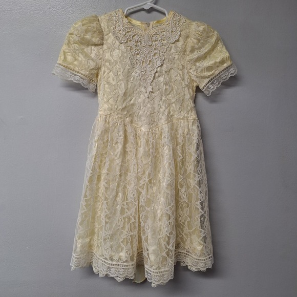 | Product Features | A charming ivory lace dress from Gunne Sax by Jessica McClintock. This exquisite dress features delicate lace overlay with a satin underlayer, short puffy sleeves with lace trim, and a beautiful ornate lace collar. A satin sash at the waist ties in the back, adding a touch of elegance. Perfect for a flower girl, birthday party, or a special occasion.Style: Fit & FlareDress Length: Knee LengthDepartment: GirlsSleeve Length: Short SleeveOccasion: Party, Holy Communion, WeddingFabric Type: LacePattern: FloralSeason: Spring, SummerMaterial: 100% PolyesterNeckline: Round NeckSleeve Type: Puff SleeveClosure: ZipAccents: LaceFeatures: Belted, LinedKeywords: girls dress, lace dress, puffy sleeve, formal dress, party dress, flower girl, special occasion, vintage style, ivory dress, satin sash, ornate collar, kids fashion | ||