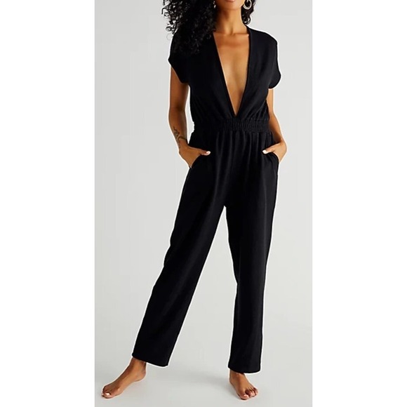 - Women >Pants & Jumpsuits >Jumpsuits & Rompers > NWT Free People Beach Rita One Piece Jumpsuit Black Pockets Short Sleeve Small