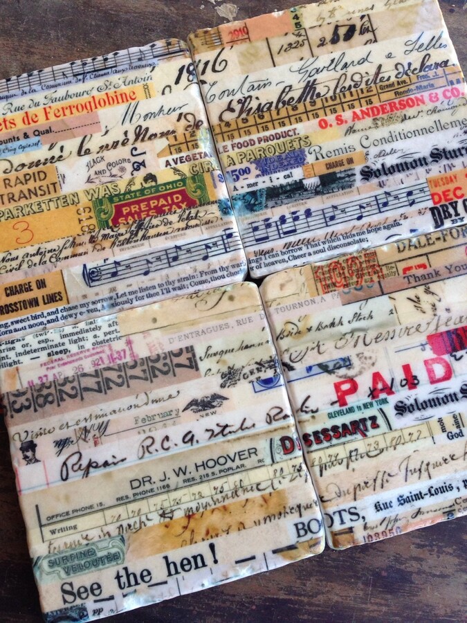 Product Features Details:These coasters feature a cool collection of vintage snipits... from posters, receipt books, letters, signs etc. Each 4x4 inch coaster is made from tumbled marble tiles, using a technique that allows the colors & character of the stone to show through the image. Each tile has been well sealed to ensure lots of use & is fully backed in cork to protect your tabletops. Sick of flimsy, slipping coasters? This set is perfectly weighted to make sure that they never stick to your drink! A nice, hearty piece of vintage art for your tables! When creating my line of vintage inspired housewares, my goal was to create a product that was both useful & beautiful. I hope that you enjoy these coasters for many years! Please allow 7-10 days for production of your pieces. If you need your order by a certain date just drop us a line & we can make it happen! The coasters can be wiped clean with a damp cloth when needed - they are not dishwasher safe. Thanks for looking! Ephemera Coasters - Set Of 4