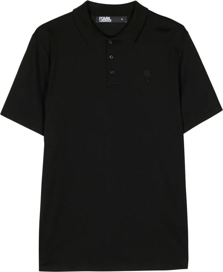 | Product Features | Details:jet black stretch-cotton signature Mini Ikonik Karl patch polo collar front button placket drop shoulder short sleeves short side slits straight hem | ||