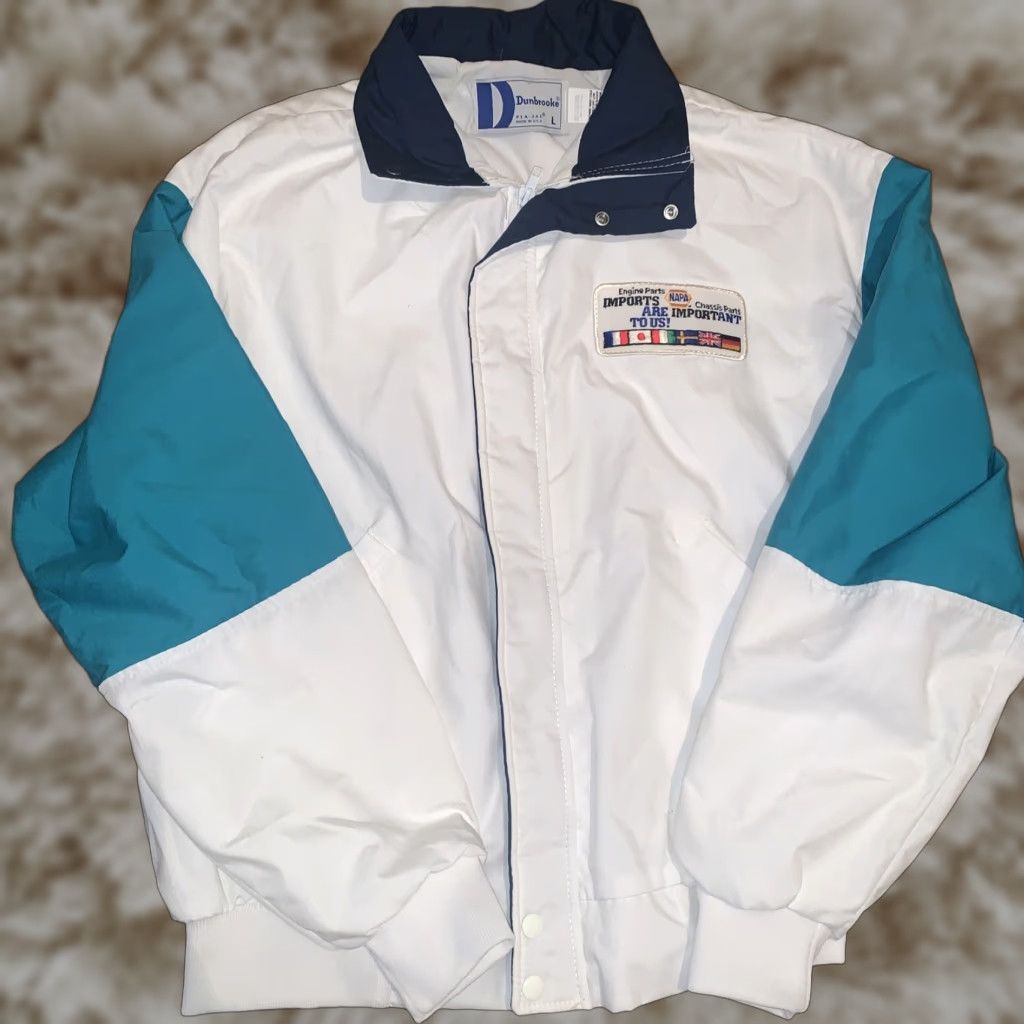 VINTAGE Dunbrooke NAPA Bomber Jacket Made In USA Full Zip L White Satin Lined Men Jacket USA Vintage Bomber Theme 70s 80s