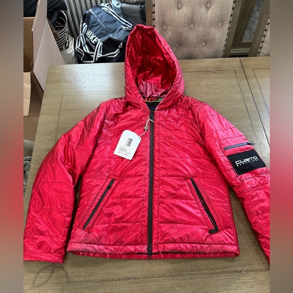 | Product Features | Vibrant red puffer jacket by Custo Barcelona. Features a hood and zippered pockets. Stylish and warm for outdoor fun. | ||
