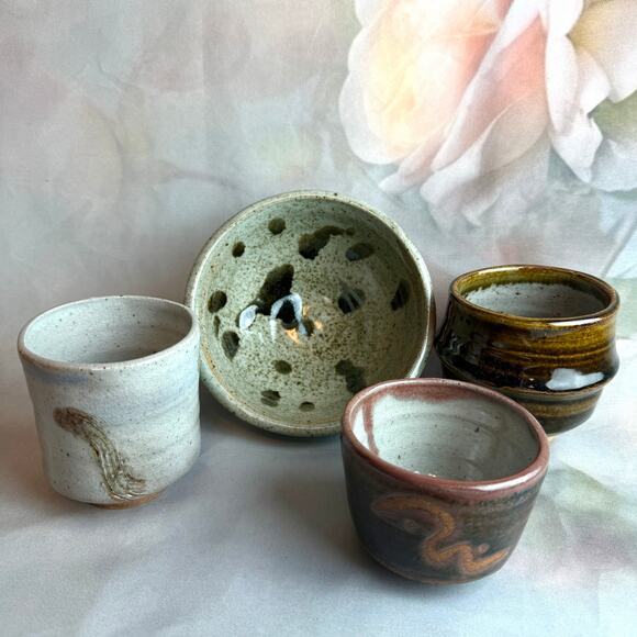 - Home >Dining >Drinkware > Vintage MCM Japanese Style Artisan Tea-Ware Stoneware Three Tea Cups & Bowl