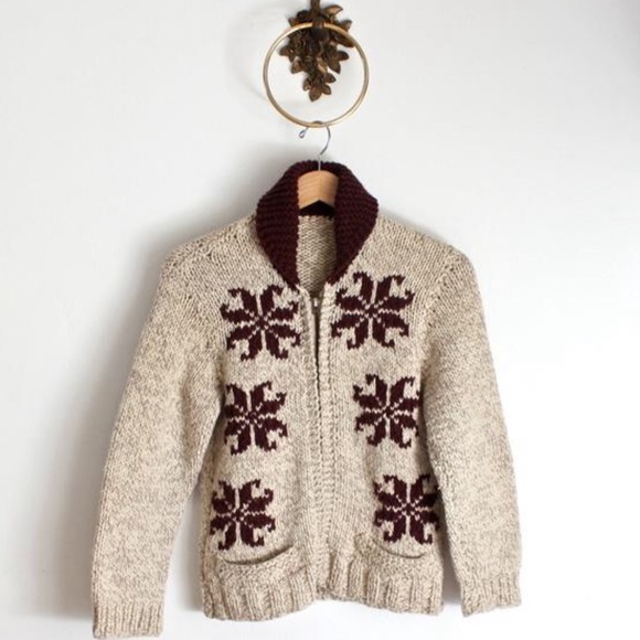 | Product Features | Vintage wool cable knit sweater full of charm! This sweater has a great star-flake detail with 2 front pockets. Heavy knit to keep you warm on those cool Winter eve's! Great chunky brass zipper up the front. Get ready for Fall and Winter with this great find! Pair with your favorite jeans and riding boots! Ask for measurements! | ||