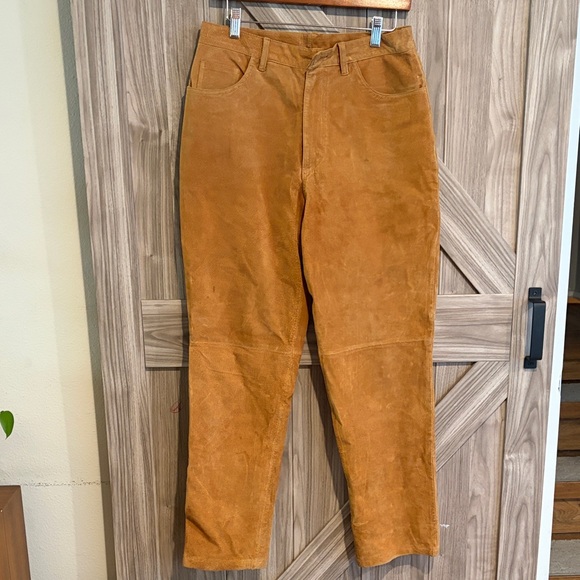 | Product Features | Chic leather pants by Bill Blass. Rich tan color. Perfect for any occasion.See button needs to be sewn on and small stain on back | ||