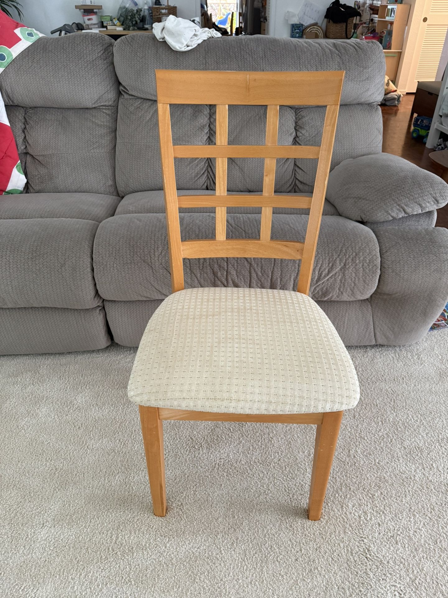 | Product Features | Fixer upper dining room chairs. Wood in good condition- just needs new upholstery/padding. Been using in a spare room but need the space now. Back height 37 inchesSeat height 17 inchesWidth 16 inchesDepth 16 inches | ||