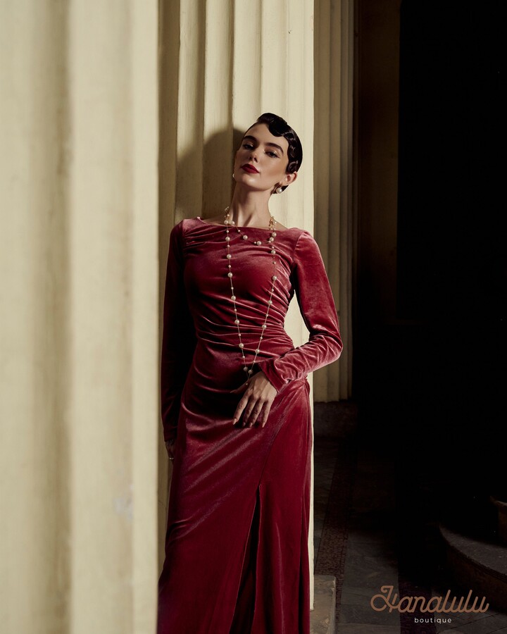 - Women's Fashion >Clothing >Dresses >Day Dresses > Etsy Ruched Velvet Gown, Rosewood Occasional Dress, Boat Neck