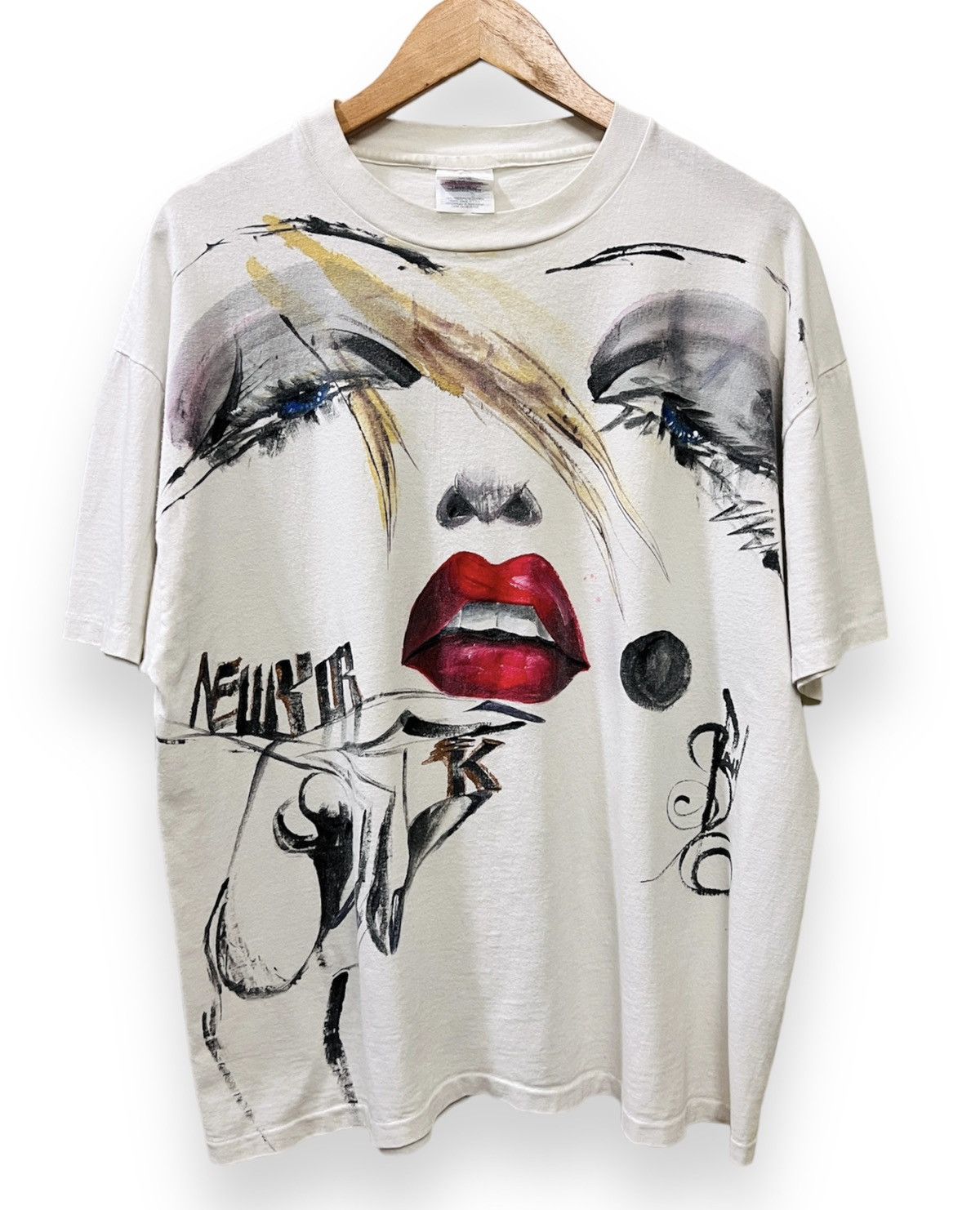 | Product Features | Seller DescriptionVintage 90s New York art shirt featuring a huge front hit of a woman’s face holding the “k” from New YorkMarilyn Monroe similarity but not too sure who the person is suppose to be or who the artist is (included a pic of their signature in case someone may know)Small stain on front, haven’t tried to remove it yet (see pic). Other than that, it is in great condition and the graphic pops in person. Hanes Heavyweight tag - single stitch Size XL - 23.4W x 28.2LWhiteVintage | ||