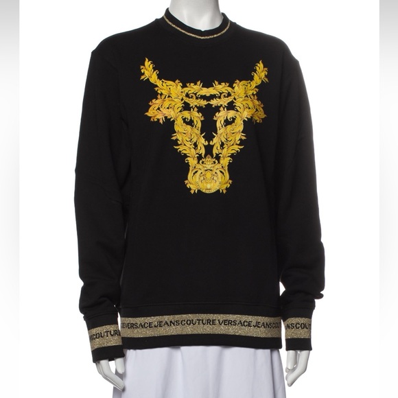 | Product Features | Authentic NWT Versace Jeans Couture Graphic Print Crew Neck Sweater Size XS/S. Graphic print is like a face of the Bull. The sweater is XS but is oversize and will fit a Small. PTP- 22“, Length- shoulder to hem: 27“. Sweater design is gorgeous with gold trims at the sleeves and hem. Perfect sweater to wear for a party this Winter. | ||
