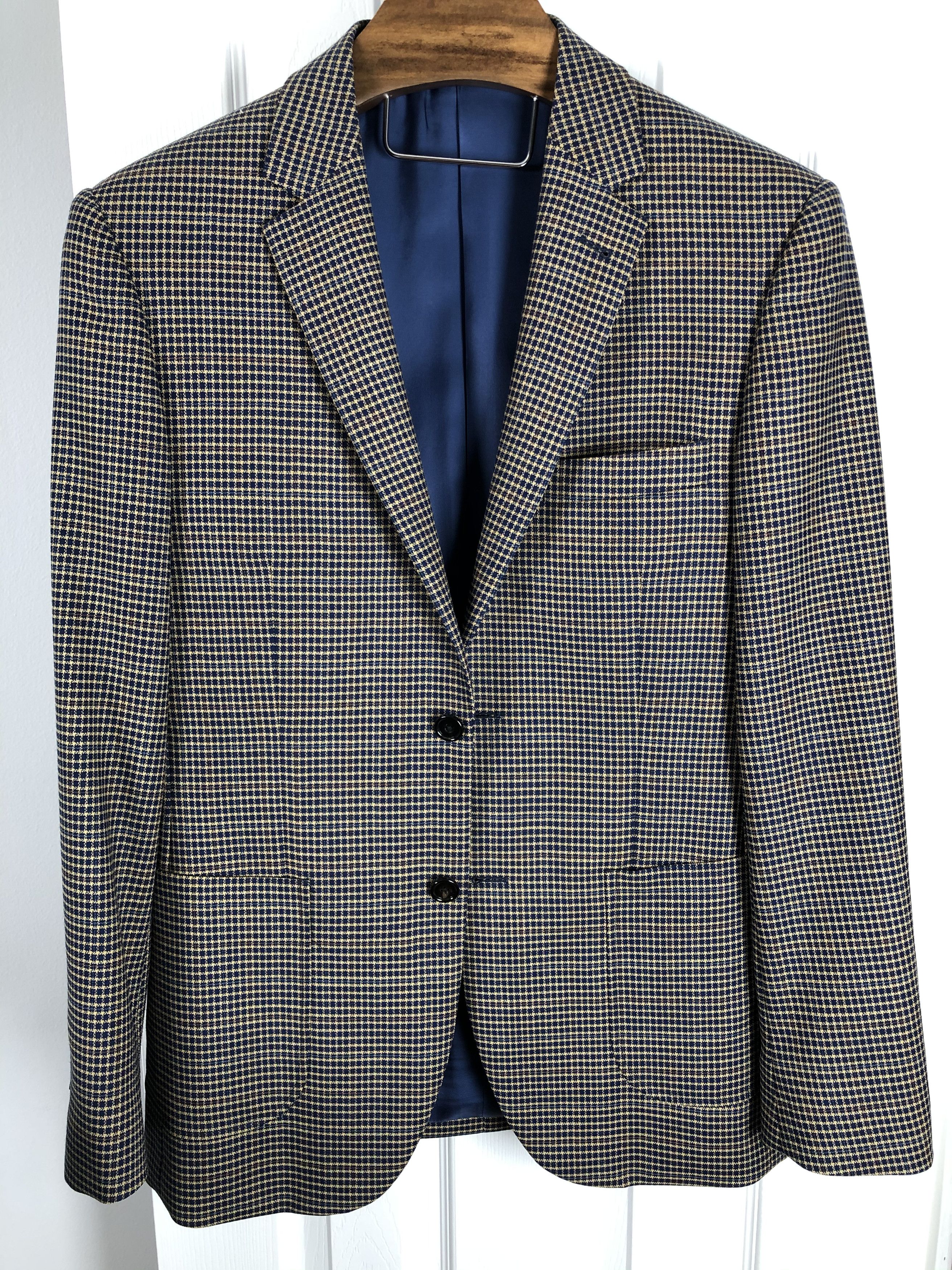 | Product Features | Seller DescriptionRetail Price: $349This is a beautiful made-to-measure blazer, ordered in 2015, with no signs of wear. In the photos I've included my exact measurements used when ordering this jacket, but for reference I wear a 36R in off-the-rack jackets. The sleeves have functioning button-holes, so sleeve length can be adjusted slightly but not much. There is a custom monogram above the inner pocket, but this can be easily patched over if desired.Other features include side vents, patch pockets, padded shoulders, and half canvas construction. The fabric has a very nice light blue and orange overcheck. Message me with questions.Multi | ||
