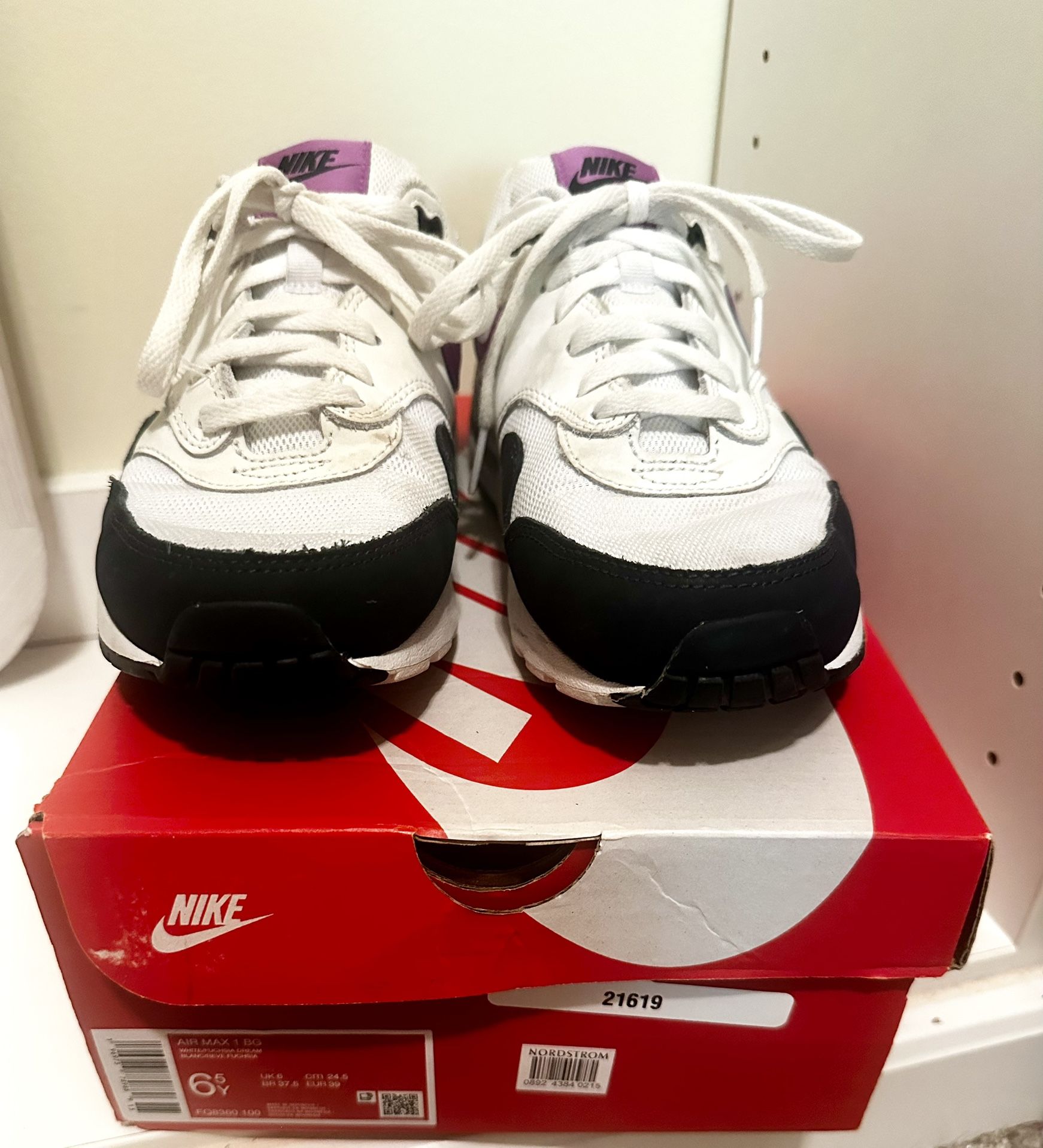 | Product Features | Nike Air Max 1 BG (GS 6.5Y / Women’s 8) – White / Fuchsia Dream 💜✨ Immaculate condition – worn fewer than 5 times!Originally purchased from Nordstrom and comes with the original Nike box. These were worn very lightly for one school year. My daughter is in private school and has way more shoes than she could ever actually wear. • Style Code: FQ8360-100 • Size: 6.5Y (Youth) = Women’s 8 • Colorway: White / Fuchsia Dream / Black • Manufacture Dates: 04/25/2023 – 07/14/2023 • Original Retail: $110 • Condition: Gently worn soles, but uppers are crisp, clean, and structured. Inside and out, they’re in beautiful shape.The lighting in these photos does NOT do them justice — they look even better in person!Pickup in South Forsyth / Alpharetta / Cumming area | ||