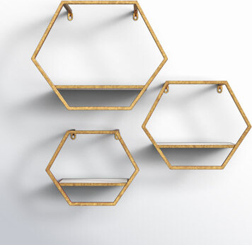 - Home & Living >Furniture >Storage & Modular >Bookcases & Shelves > Joss & Main Set of 3 Hexagon Shaped Wall Shelves - Gold Metal and Wood Wall Accent Shelves