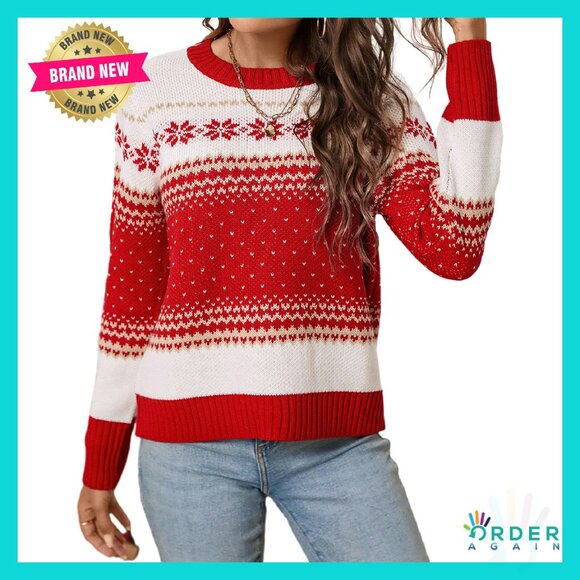 - Women >Sweaters > Festive Fair Isle Pullover Cozy Ribbed Knit Crewneck Holiday Sweater