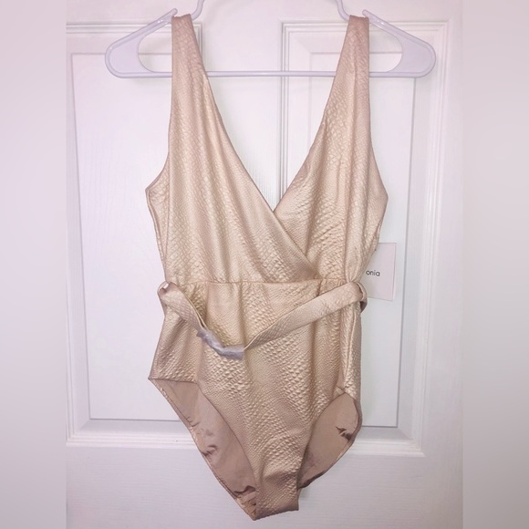 | Product Features | Onia “Michelle” Crocodile pattern one piece in sand color. V neck in front and back. Adjustable belt detail on waist still in wrapping. Moderate coverage. Size medium. New with tags. “At Onia, nothing is overlooked in our pursuit to produce the finest swim and ready to wear garments possible. We are dedicated to developing clean silhouettes crafted from high quality materials and fabrics, sourced from the finest factories worldwide. Our product embody a refined aesthetic and can be worn for a broad range of activities, with each piece being vigorously tested to withstand extended sun and water exposure.”Feel free to ask questions or make me an offer! | ||