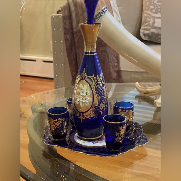 | Product Features | Antique Murano Blue with Gold leaf pattern Decanter with painted flower with 4 glasses set and tray. Mint condition flawless. From Italy in 70’s. Smoke free home any questions please ask. | ||