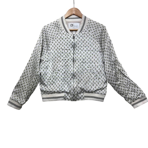 | Product Features | A striking bomber jacket from Tiny Editions for Anthropologie, boasting a delicate white background adorned with an all-over green and blue floral pattern. This stylish piece features a classic bomber silhouette with ribbed cuffs, collar, and hem, a full zip front closure, and convenient side pockets. The back of the jacket showcases a larger, more intricate embroidered floral design, adding a unique artistic touch.Measurements:• Chest: 21.5"• Length: 21.5"• Sleeve Length: 23 inStyle: Bomber JacketAccents: ZipperFeatures: Lined, Elastic WaistFabric Type: SatinClosure: ZipKeywords: bomber jacket, tiny editions, anthropologie, floral print, lightweight jacket, casual, daytime, artistic, womens outerwear, spring fashion, garden printShipping processed in 1-2 business daysItems from a smoke-free homePlease see my other items for similar styles and sizes | ||