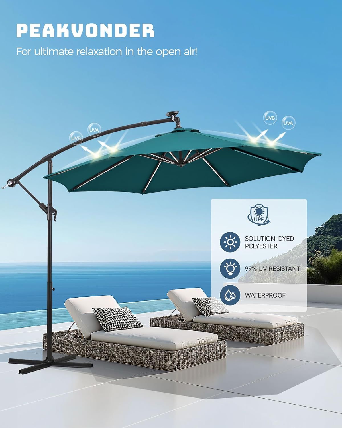 | Product Features | Color Tan, Teal Blue, Navy Blue, red, dark green About this item🌈 8-Color Light Extravaganza!-Upgrade your nights with 10 ft offset patio umbrella with solar lights! ✨ Brighter LED strips along ALL ribs + 8 vibrant colors (not just boring white!) – perfect for poolside parties 🎉 or market umbrella romance. Switch between task lighting 💡 and disco mode 💃 with 1 tap!😎"Solar +🔌 Power Bank = 24/7 Glow!-1800mAh battery = 5hrs solar-powered magic! ☀️ Rainy day? Charge via hidden USB-C port with ANY power bank. Your large offset outdoor umbrella with lights stays lit for BBQs, deck umbrella dinners, or midnight swims 🌙!🛡 Hurricane-Proof Sturdy Frame!-8 rust-proof SQUARE ribs + wind-vented crown 🌪️ laughs at storms! Our offset outdoor umbrellas for patio with stands guard your pool umbrella for inside of pool 🏊 or cantilever patio umbrellas. Shake test passed ✅, fearlessly!☀ SPF 50+ Sun Fortress!-Duarble polyester blocks 98% UV rays 🛡 + fade resistant! The large cantilever offset patio umbrella creates 10ft shadow sanctuary 🌴 – ideal for umbrella outdoor patio tables or market umbrella cafes. Sunburns? Never heard of her!🎉 10-Second Setup Magic!-No tools! Just snap the offset patio umbrella with stands included 🧩 and crank-open. Stores FLAT – fits in tiny spaces 🚗. Deck umbrella? Pool umbrella? Swap locations faster than you flip burgers! 🍔🌈 Attention:Base is not included. | ||