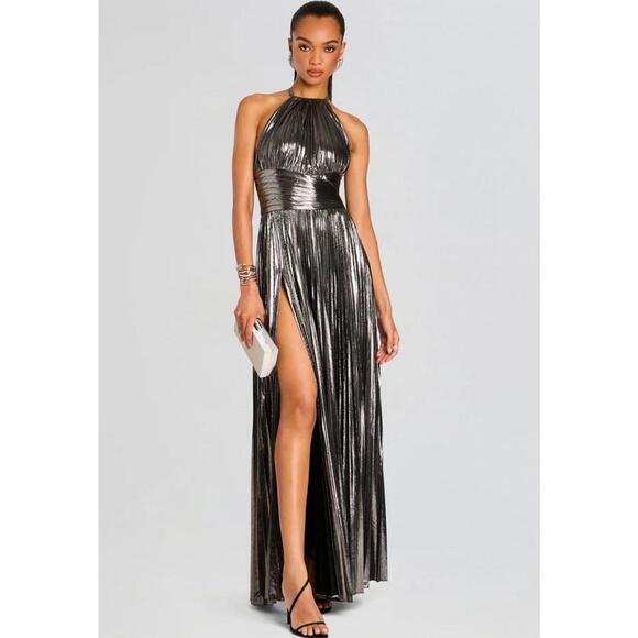- Women >Dresses > $798 Retrofete Reiss Dress Silver Lame Pleated Halter Cape Designer Dress XL
