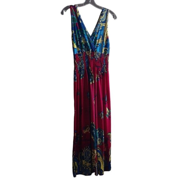 | Product Features | Poolside Dress Summer Smocked Sundress Bright Colors Paisley Sleeveless CrossoveStyle: Maxi with Smocked WaistCondition:Pre-owned - Excellent condition but no tagsColors:Magenta, Blue, Green, Yellow Shoulder to hem:51"Armpit to Armpit:19"Fabric: Poly SpandexSeason:Spring / SummerDetails: Smocked Waist, Boho, Crossover Bodice | ||