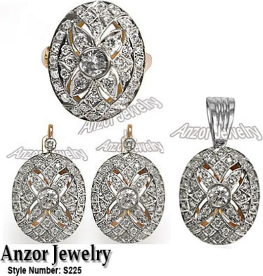 | Product Features | Details:Style Number: #S225 Imperial & elegant. This solid 14k gold ring, earrings & pendant are created in a Victorian inspired, old Russian design. Sparkling 150 diamonds totaling 4.45ct. are set in white gold & a rose gold ring & earrings. Sturdy french leverback locks provide a secure fit. Traditionally presented to your bride to be, today this ring can be worn for any occasion. This is a brand new item & is manufactured on our premises. You are buying this item from the NYC Diamond District. Sizes available: 4 to 9.1/2 in full, half & quarter sizes. Item will be shipped within 3-5 business days after payment is cleared.Available in any Stone you Like Please ask for the Price,A Company Appraisal Is Included With Your Purchase. AGI Appraisal Available: Value $8,900.00 + $75 Retail Replacement & Appraisal Value $8,900.00 Order By Phone: 24 hours a day, 7 days a week. 1.800.548. 0411. or 1 917.488.1146 100% Satisfaction Guaranteed.Our Warranty: 5 (five) Years on Workmanship!Наши телефоны: 1 800 548 0411 - 1-917 488 1146 Приём заказов круглосуточно по телефону или через Интернет. Metal: 14k Solid Rose & White Gold Approximate Weight: 26.00 Grams Size: Ring Tall Width 20mm Wide Width 17mm Top Shank 3.5mm Bottom Shank 3mm Earrings 24.90mm (.98 inches) of Tall 17.30mm (.68 inches) of Wide Pendant Top to Bottom 21mm Width 17mm Stones: Total Diamond weight 4.45 CWT Diamond Quantity 150 Pieces. Color/Clarity: Color: G Clarity: SI1 (100% eye clean) 14K Rose & White Gold Diamond Jewelry Set Ring, Earrings, Pendant | ||
