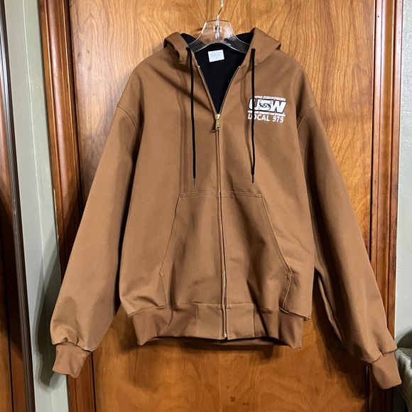 | Product Features | United steel workers, unity and strength for workers local 979 brand made in America workweardurable jacket frame resistant material lining made of 100% cotton model number 3006–2002 heavyweight duck thermal hooded jacket | ||