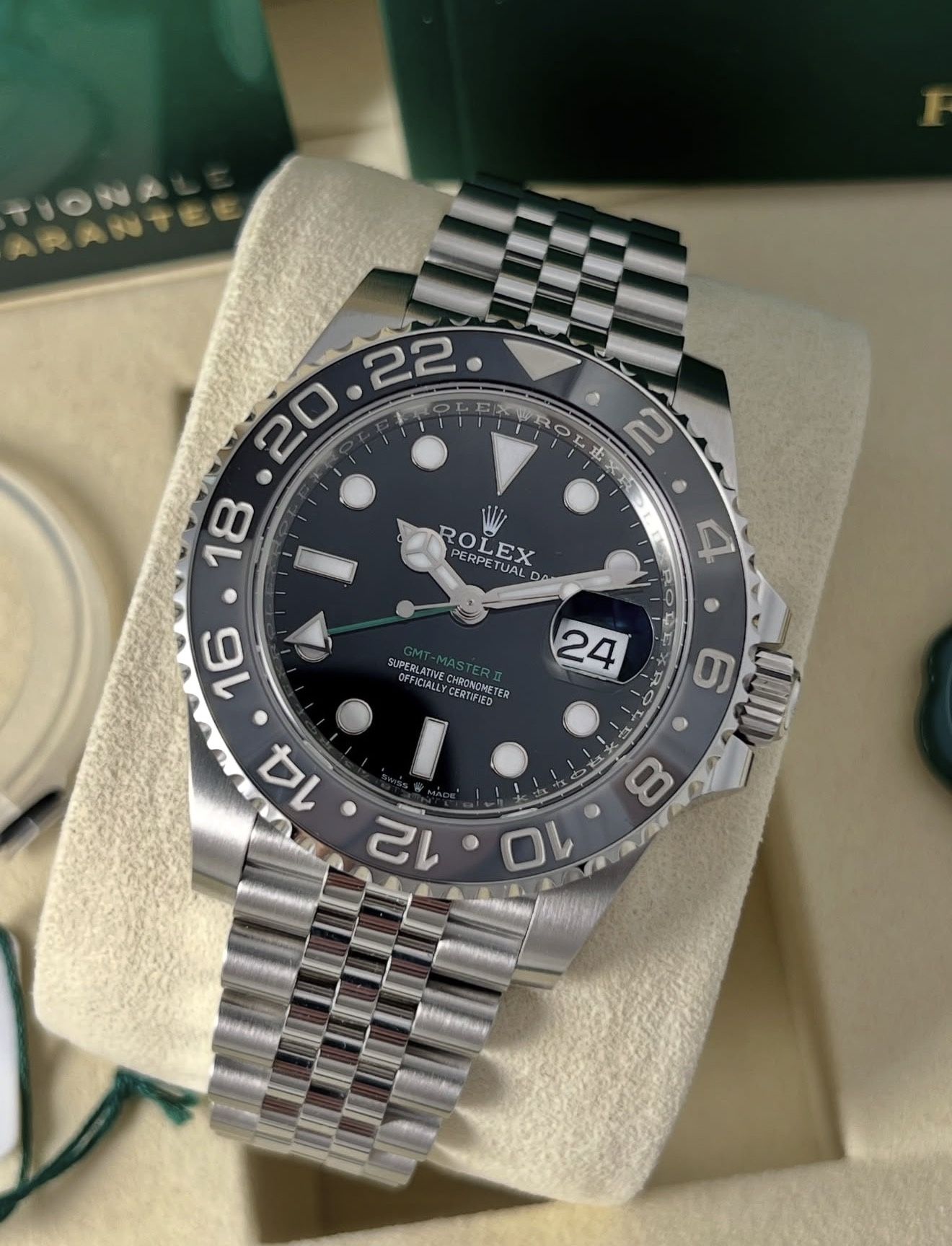 | Product Features | Brand new Rolex GMT-Master II 126710GRNR “Bruce Wayne” Jubilee bracelet. Comes full set - watch, box, card, white & green tag, booklets. | ||