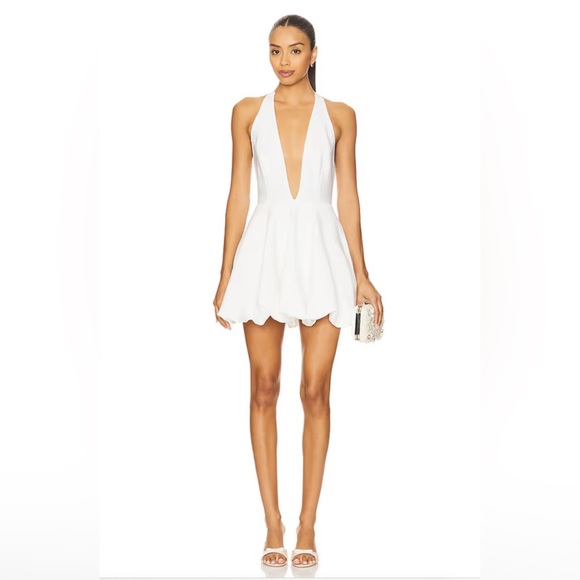 | Product Features | Gorgeous Elliatt Fiona Bubble Skirt Mini Dress in white — worn once for a wedding weekend, perfect condition, no flaws. This dress is a showstopper: flattering, modern, and feminine with the signature Elliatt sculpted silhouette.Details:• Size XS• Color: White• Fabric: Ponte textile (midweight with bubble hem)• Halter self-tie neck with plunging neckline• Hidden back zip closure• Partially lined• Shoulder to hem: ~32.5”• Originally $207 on Revolve• Style No. ELLI-WD953This is the perfect piece for engagement parties, rehearsal dinners, or any occasion where you want to look effortlessly stunning. So flattering on!Condition: Great. Worn once. | ||