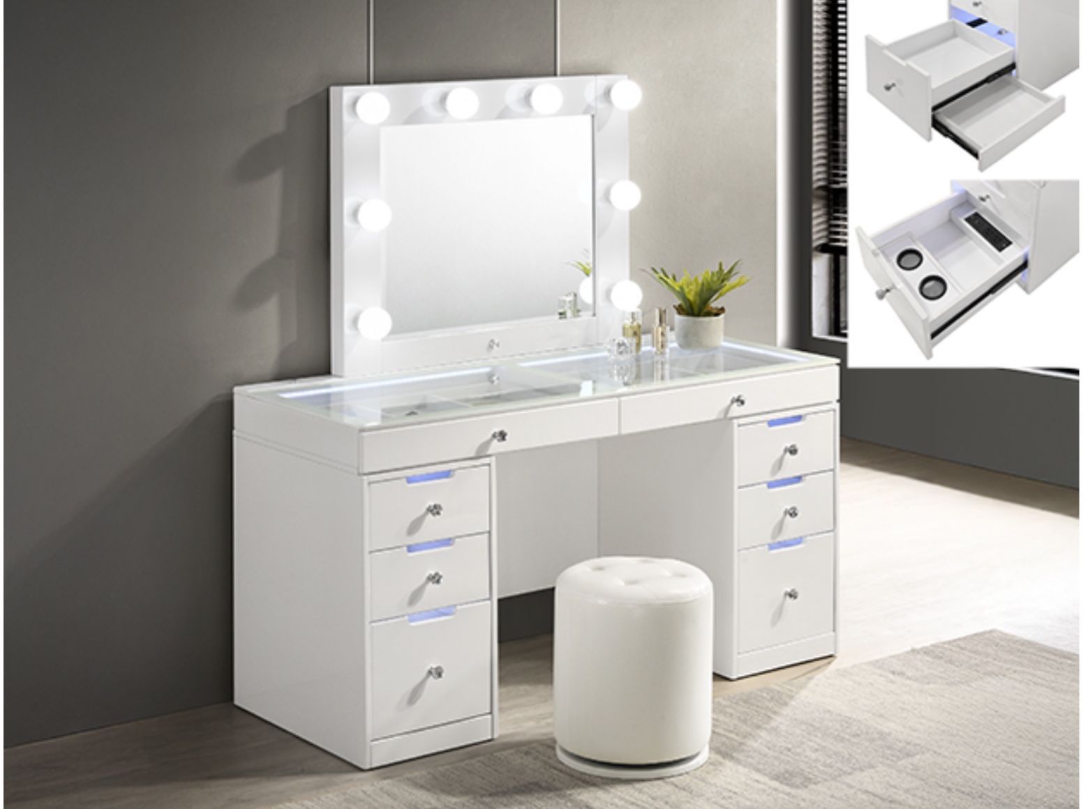 | Product Features | Its glossy white finish and clean lines are complemented by the sparkle of crystal-like knobs, adding a touch of sophistication to your personal space. The spacious tabletop, graced with a large mirror surrounded by radiant lights, offers an ideal stage for beauty routines, ensuring flawless makeup application under impeccable lighting. With a variety of drawers, this vanity provides ample storage to keep essentials organized and within reach. Interior drawer lighting, integrated outlet, and hidden drawer storage are just some of the included features. | ||