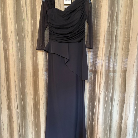 | Product Features | Chic black dress with draped neckline. Sheer long sleeves add elegance. Ideal for formal events. | ||