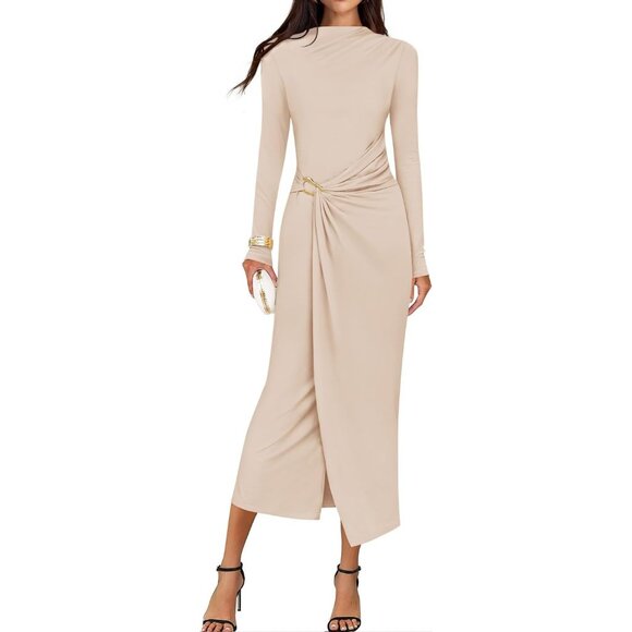 Zesica Women's Apricot Long Sleeve Mock Neck Long Midi Bodycon Cocktail Dress