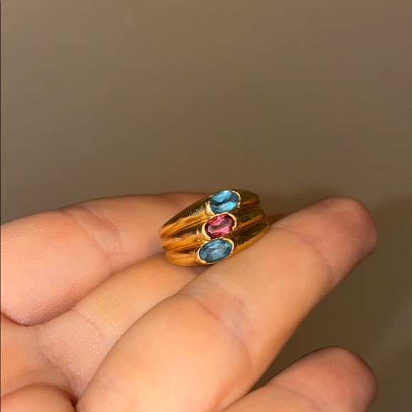 | Product Features | - 14k yellow gold- 3.7 grams- 2 oval cut Swiss blue topaz - 1 pink amethyst - asymmetrical stacked ring look- about size 6 but size up because it is wide | ||