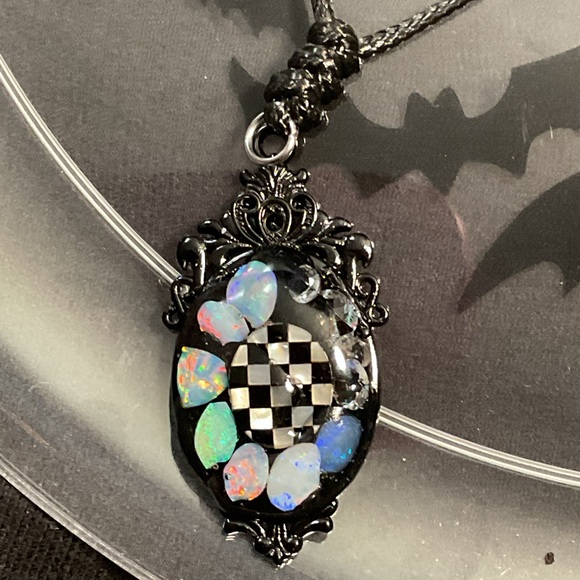 | Product Features | This is my kind of hodgepodge! It has several, beautiful opals. Well, opal chips. I try to use all of my gems, I have them for all kinds of projects like this one! The middle piece is also a chipped piece; MOP and onyx. I put a few cubic zirconia on the side. It’s on a black, alloy pendant. Comes with an adjustable chord | ||