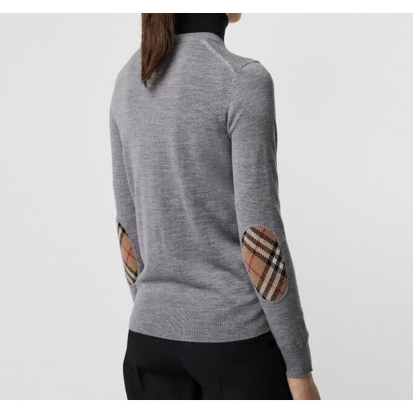 - Women >Sweaters >Crew & Scoop Necks > $830 BURBERRY BEMPTON GRAY MERINO WOOL ELBOW CHECK PATCHES PULLOVER SWEATER S