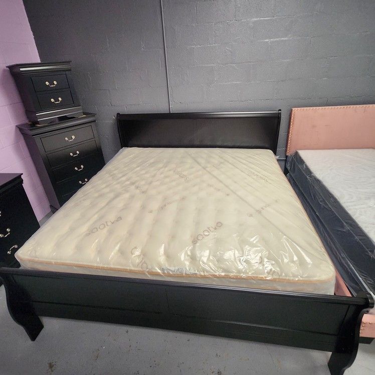 King Sliegh Bed Frame Black With Mattress Set Pillow Top