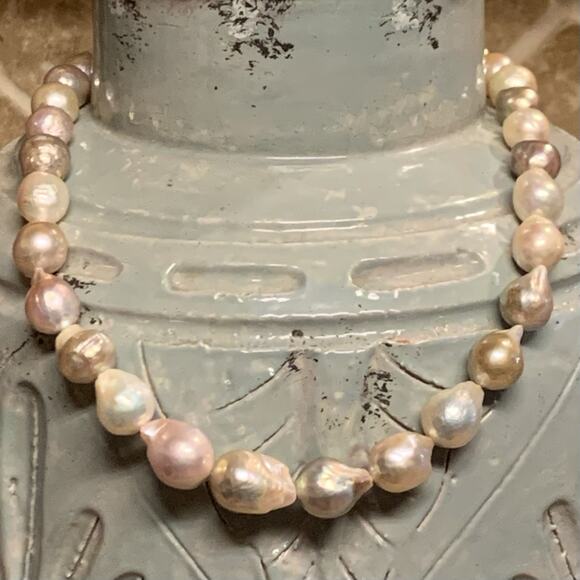 | Product Features | The Honora Ming Baroque Pearl Necklace and Bracelet Set is a stunning piece of fine jewelry crafted from sterling silver and featuring cultured Ming pearls in a beautiful pastel color. The set is signed by the brand and has a metal purity of 925 sterling silver. This elegant jewelry set is perfect for various occasions like engagements, weddings, anniversaries, birthdays, and special holidays like Christmas, Valentine's Day, and Mother's Day. The baroque-shaped pearls add a touch of beauty and sophistication to any outfit, making it a perfect gift for someone special. Hallmarked H for Honora, China and 925.Ming pearls are a combination of nature and mankind working together to make an absolutely stunning pearl. Metallic in color and larger than normal size since each pearl are grown individually in one shell.Necklace measures 20 inches long and bracelest is 8.5 inches long (fits 7 inch wrist and under)Necklace is graduating in size from 19mm to 12mm with largest in center.Colors include beautiful metallic luster of white, pink, cream and grey.Stunning set!! | ||