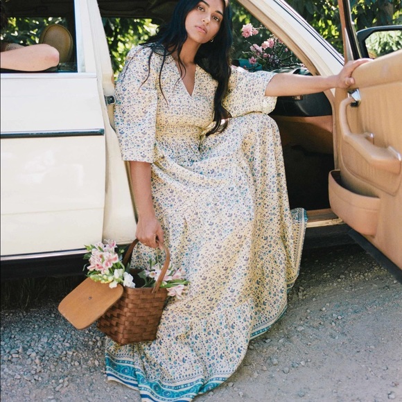 | Product Features | Intricate smocking on the chest and back panels make The Basil Dress a timeless addition to your closet. Inspired by a vintage frock, she is both effortless and eye-catching. The Basil Dress boasts a full, tiered skirt, pockets, and bell sleeves. The Larkspur Ditsy Field fabric was digitally printed in Erode, India. The Basil Dress was made by Ana, one of our talented dressmakers.3/4-sleeved Bohemian maxi dressLightweight fabric, 50% peace silk and 50% regenerative cottonYellow-cream background with a multi-colored blue floral pattern digitally printed using organically certified dyesBell sleevesIntricate chest and back smocking - we recommend ordering your usual dress size!Tiered skirtUnlined and slightly sheerBra friendlyHand wash cold, air dry recommended - after washing, do not wring the dress! | ||