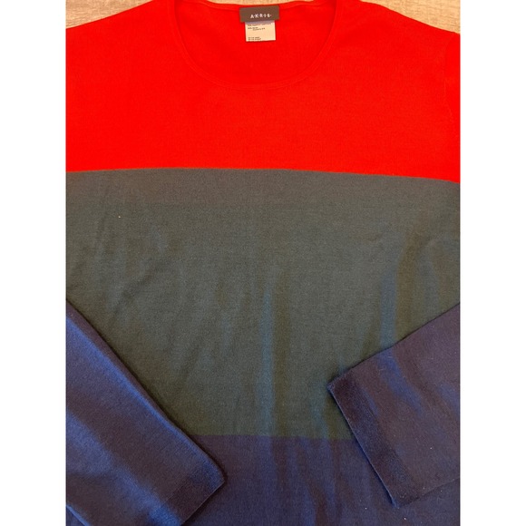 - Women >Sweaters >Crew & Scoop Necks > AKRIS Color Block Knit Sweater Orange Green Navy Cashmere Mulberry Silk Size 14