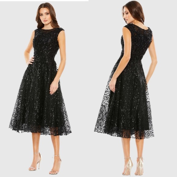 | Product Features | Mac Duggal Sequined Cap Sleeve Fit and Flare Dress in Size 2. New with tags. -Sequin fabric (100% polyester) -Partially lined bodice; fully lined skirt; semi-sheer unlined cap sleeves-Boat neckline-Short cap sleeves-Delicate embroidery accented by hand-stitched sequins-Concealed back zipper -Approx. 48" from top of shoulder to bottom hem | ||